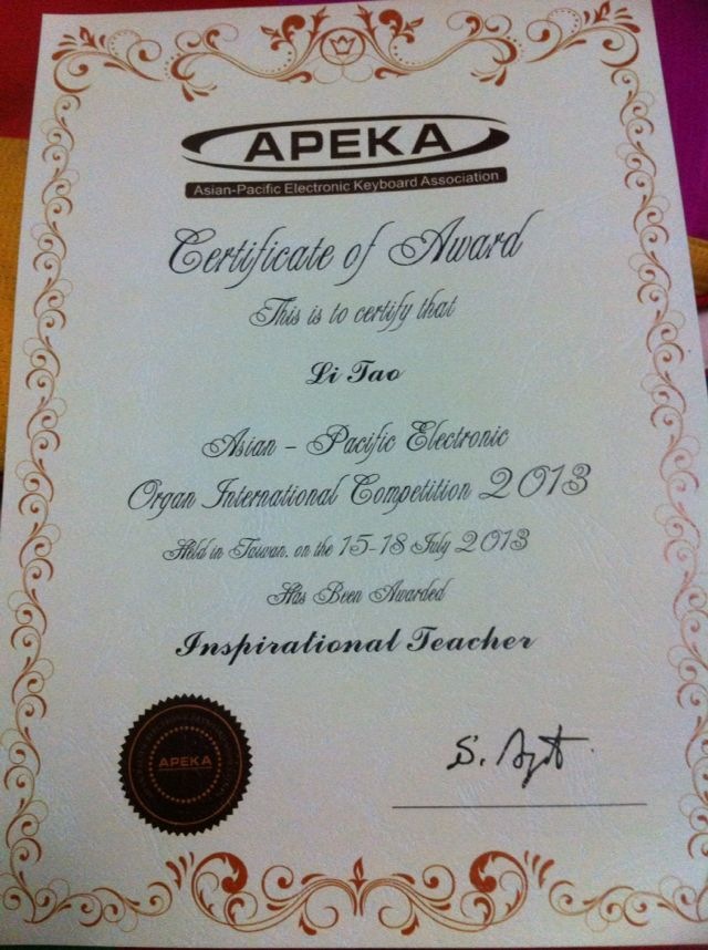 2013年7月在台湾东海大学举行的亚太地区双排键电子琴国际比赛中,公司BG大游青年教师赵书一荣获成人古典组二等奖,她的青蓝计划导师、国家一级演奏员李涛教授荣获优秀教师奖。