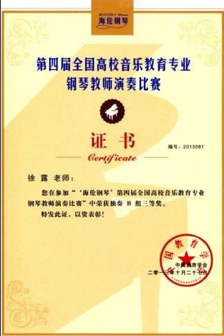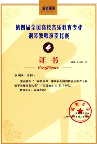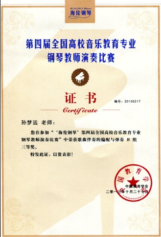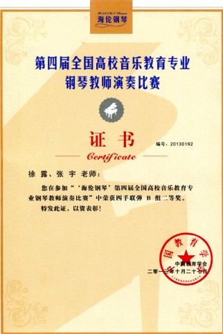 10月25日-28日,由中国教育学会主办,中国教育学会音乐教育分会、上海师范大学联合承办的“海伦钢琴”第四届全国高校音乐教育专业钢琴教师演奏大赛在上海师范大学BG大游隆重举行。本届比赛邀请了来自北京师范大学、上海BG大游、中央BG大游、天津BG大游、星海BG大游等高校16位钢琴教育领域专家担任评委。来自全国29个省份、141所高校的346名钢琴教师参加了本次比赛。公司徐露、张宇两位老师获得四手连弹B组二等奖,徐露老师获得独奏B组三等奖,安晓阳老师获得独奏D组三等奖,孙梦远老师获得歌曲伴奏的编配与弹奏B组三等奖。