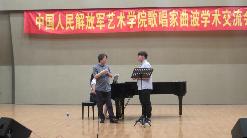 学术交流会分上午、下午两场。在学术交流会中曲波教授分别对不同声种、不同曲目的本科大一至大四的员工代表们进行一对一的大师班式教学。曲波教授不仅强调与修正员工们对于歌曲的艺术处理,语音咬字,同时也引导员工不忽视发声训练,要求节奏精准,歌唱时气息给予充分支持。曲波教授或是用抽象的言语去引导员工充分去发挥自己的声音潜能,或是自己亲自示范,给大家正确声音的听觉感受。可以说不仅台上演唱的员工受益匪浅,台下的师生也能够得到新的启发,并且能够运用到自己日后的声乐训练、演唱实践当中。