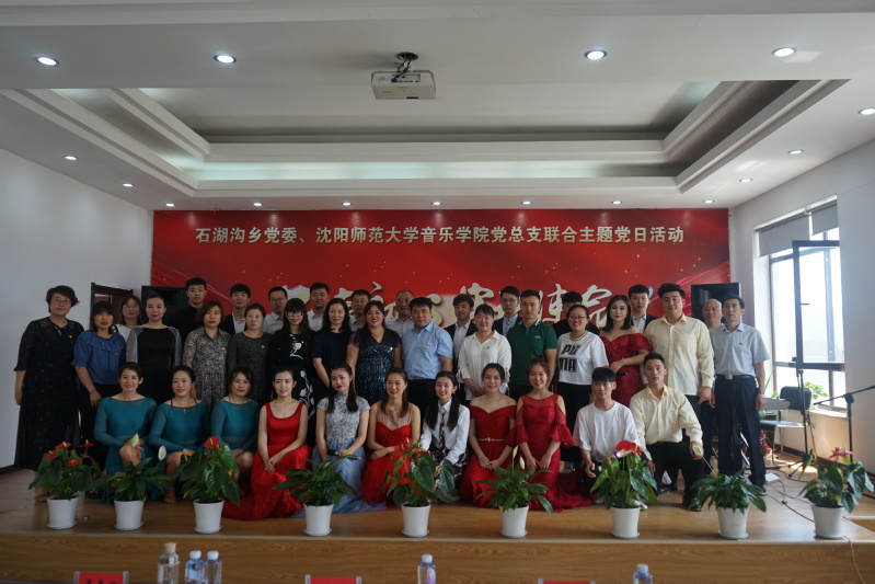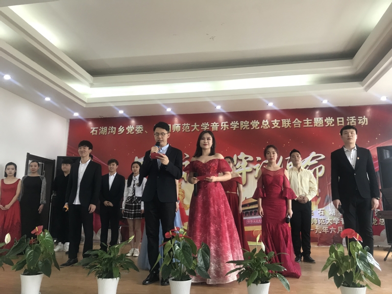 座谈后,联合党日文艺演出正式展开。除上述人员外,石湖沟乡党委机关全体干部与全乡13个村、社区两委干部共百余人观看了演出。演出以石湖沟乡党委慕书记致欢迎词拉开序幕,共计14个节目。公司师生充分发挥专业特色,倾情演绎《我们都是追梦人》、《国家》、《把幸福给你》、《我爱你中国》、《在那桃花盛开的地方》、《不忘初心》等一首首脍炙人口、紧扣主题的经典爱国歌曲。一曲体现当代乡机关干部风貌的热辣舞蹈《激情拉丁舞》将演出推向高潮。最后,全场齐唱《我和我的祖国》,共同表达了对于祖国的热爱,对于建党98周年、建国70周年的祝福。全场氛围热烈,俨然一个大型的家庭聚会,演出后双方领导与全体演职人员合影留念,留下这欢快融合的美妙时刻。石湖沟乡领导对于本次演出给予高度评价,广大乡村干部也给予一致好评,纷纷表示如此专业水评的演出确实能够激发心中的爱国热情,点燃“初心”之光,照亮“使命”之途。