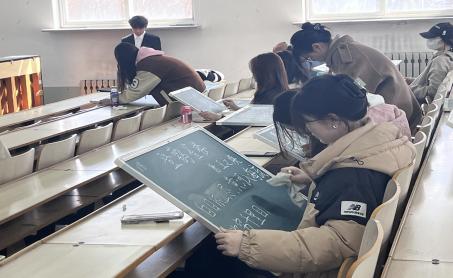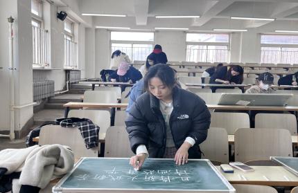 在决赛现场,同学们手持粉笔、神情专注、细致谨慎、认真书写,在“黑”与“白”的交替中,或随性,或有力,或清秀隽美,或稳重端庄。一笔一划,一勾一折,无处不体现着书写者的用心和才情。在本次决赛中,有多名同学为活动的顺利进行做出了积极的贡献。2022级音乐表演一班的梁硕同学担任主持人,宣读比赛规则;2022级音乐表演三班的杜明徽同学友情助演弹奏钢琴,欢快优美的音乐舒缓了参赛选手紧张的心情;2022级音乐表演一班的张伟哲同学和2022级音乐学(师范)班的王姬同学认真讲解了此次活动的意义,活跃了比赛气氛。经决赛,共有十名同学获奖。